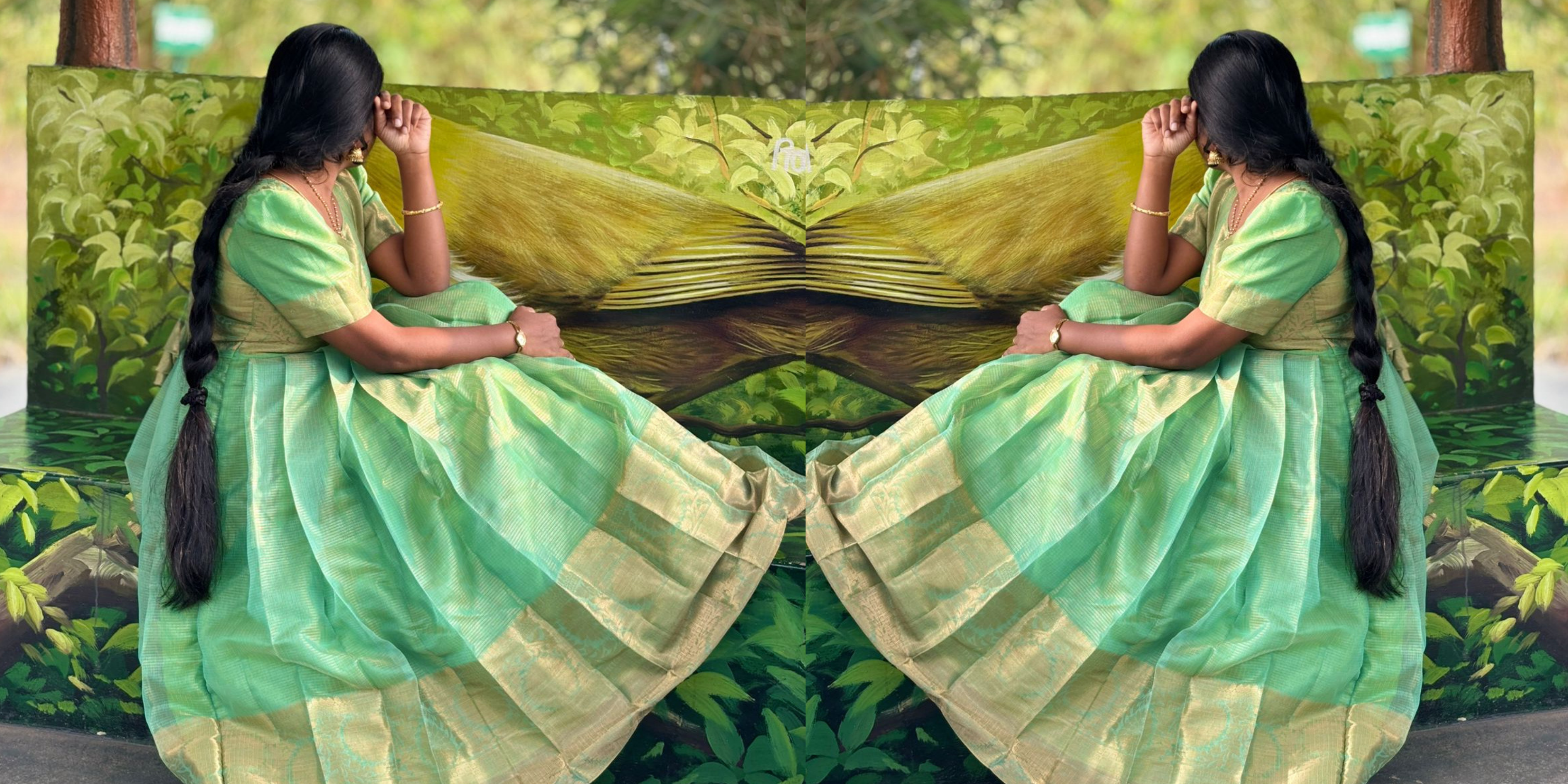 Narayanapet Cotton Kids Skirt & Top | Checked Pattern with Golden Zari Border & Puff Sleeve Top