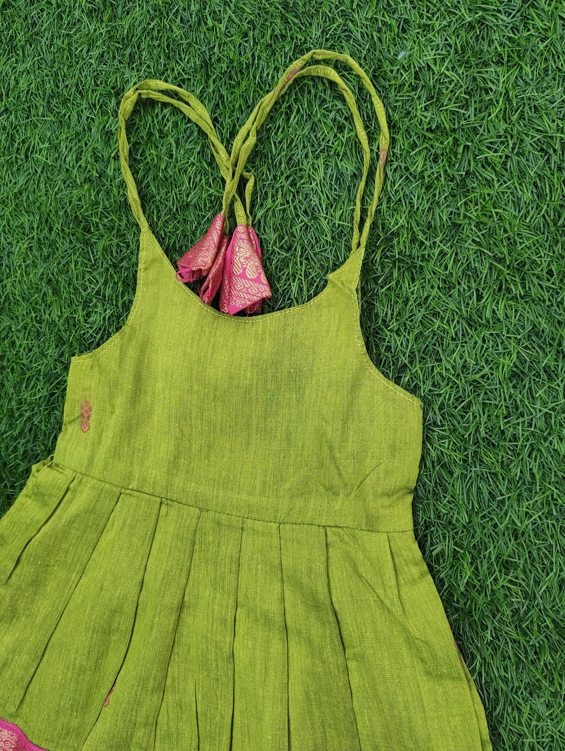 Kalyani Cotton Infants Tie-Up Strap Dress – Parrot Green & Pink Combo