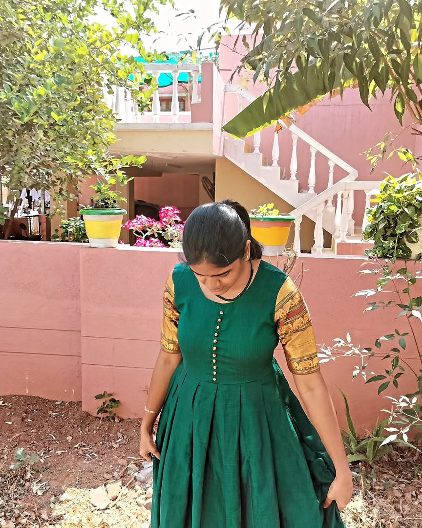 Embrace the charm of Lavanika Narayanapet cotton with this full-length ethnic maxi. Crafted from pure Narayanapet fabric, this gown blends traditional elegance with modern comfort. Featuring a subtle small border at the hem and a yoke adorned with delicate hand-made potli buttons, it offers a graceful and refined look. Perfect for casual gatherings, festive occasions, or day-to-evening wear.